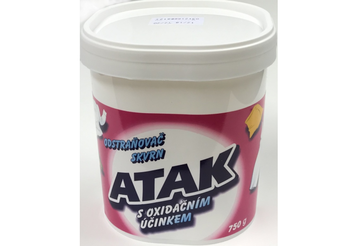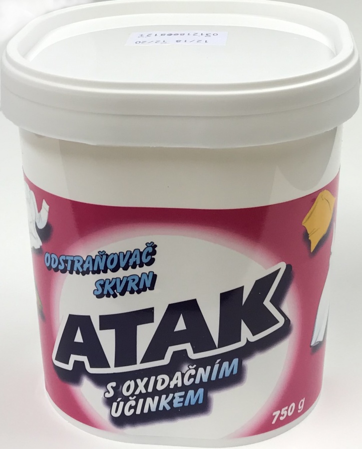 Použití: Stačí přidat k běžnému pracímu prostředku nebo nanést přímo na skvrnu. ATAK účinně odstraňuje i velmi odolné skvrny např. od červeného vína, ovoce, kávy, čaje, inkoustu, apod.. Jelikož neobsahuje chlór, chrání pevnost vašeho oblečení i jeho barvy.