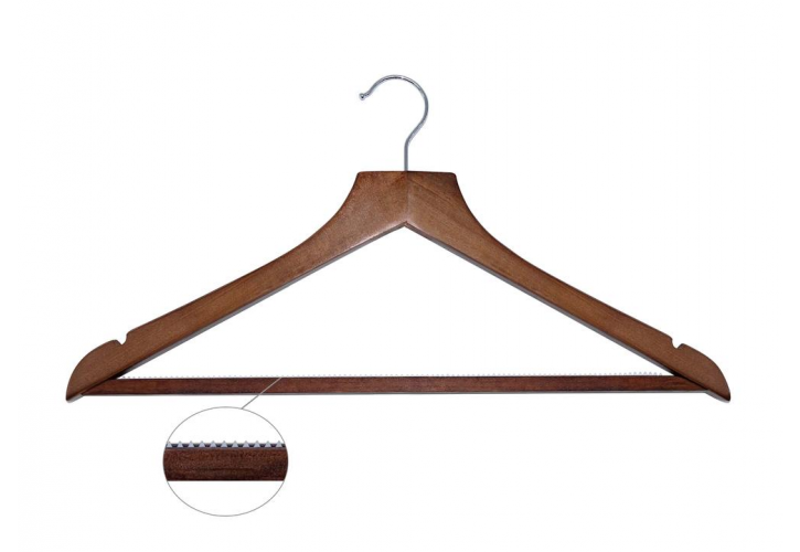 Dřevěné ramínko v barvě tmavého dřeva s tyčí na kalhoty, otočným kovovým háčkem a protiskluzovou lištou. Skvělý poměr cena/výkon/kvalita. Velmi kvalitní hotelové ramínko za velmi příznivou cenu.