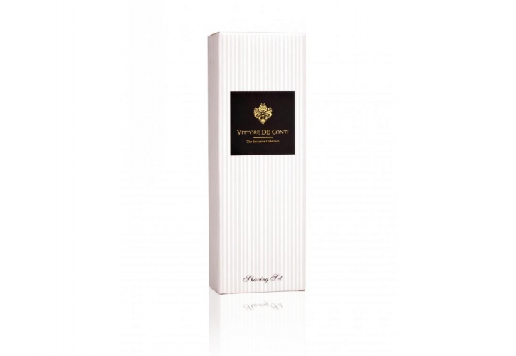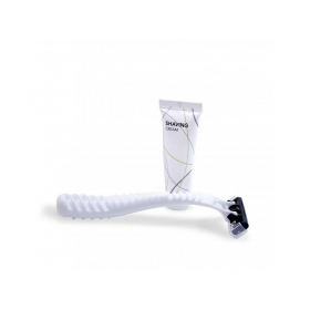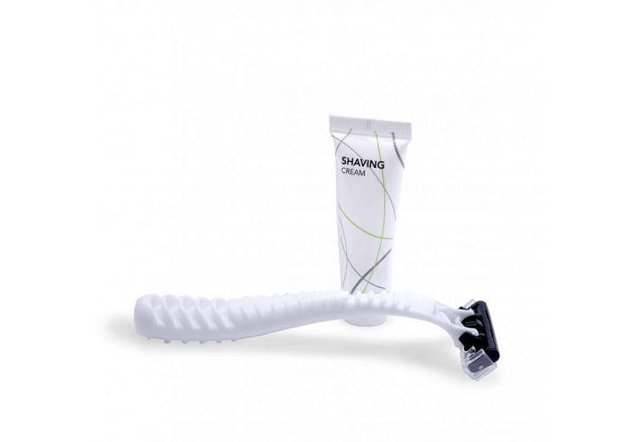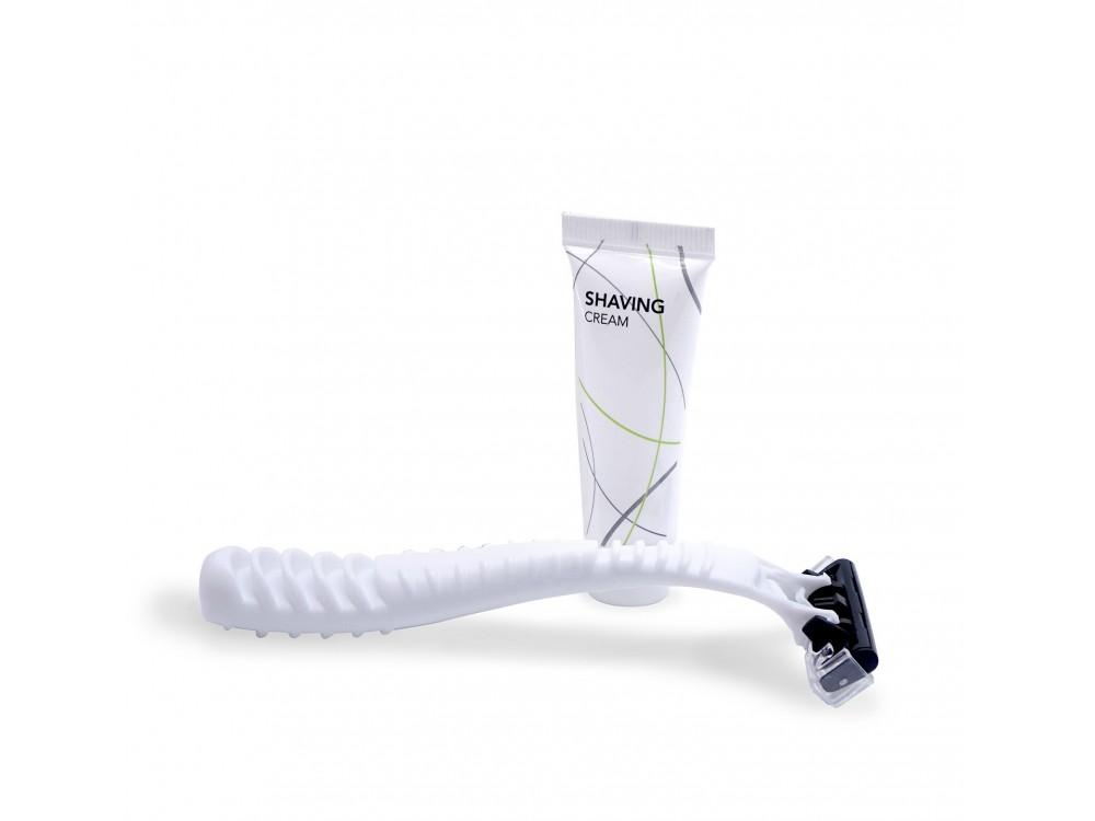 Obsah krabičky: strojek na holení se třemi břity, krém na holení