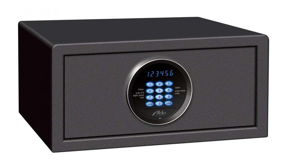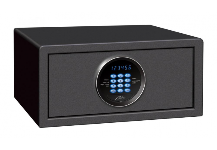 Velmi moderní, elegantní a vysoce praktický trezor ALDA DIGI Plus je skvělým řešením provaše hosty. Díky své velikosti je schopen bezpečně uschovat i notebooky o velikosti až 14". Vaši hosté se tak budou cítit bezpečně a chráněni před ztrátou důležitých informací. Díky svému velmi modernímu a elegantnímu vzhledu může být trezor umístěn samostatně v otevřeném prostoru pokoje. Napájení trezoru je prostřednictvím 4 kusů AA baterií (nízká spotřeba).
