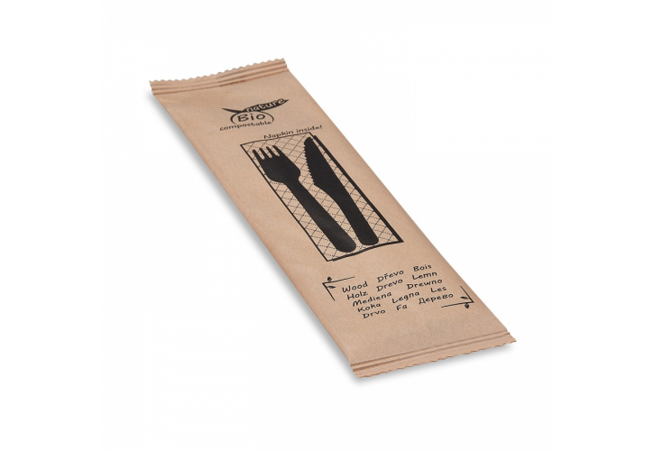 Sada dřevěných příborů - vidlička+nůž+ubrousek. Hygienicky balené.