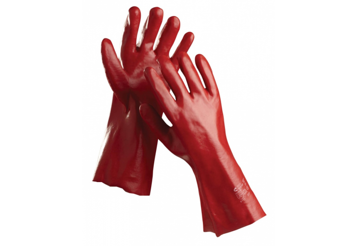 Rukavice šité z bavlněného úpletu, máčené v PVC, v celkových délkách 35 cm.