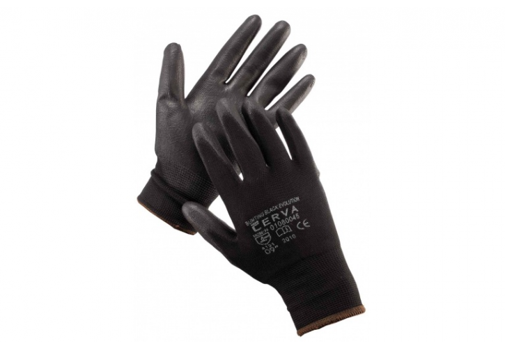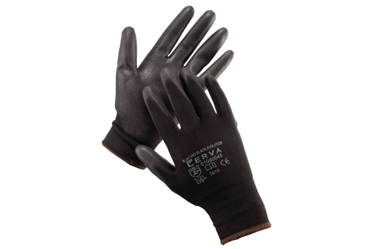 Pletené bezešvé polyesterové, rukavice s tenkou vrstvou polyuretanu v dlani a na prstech a pružnou manžetou.