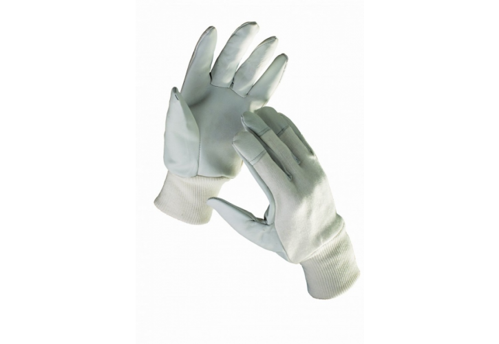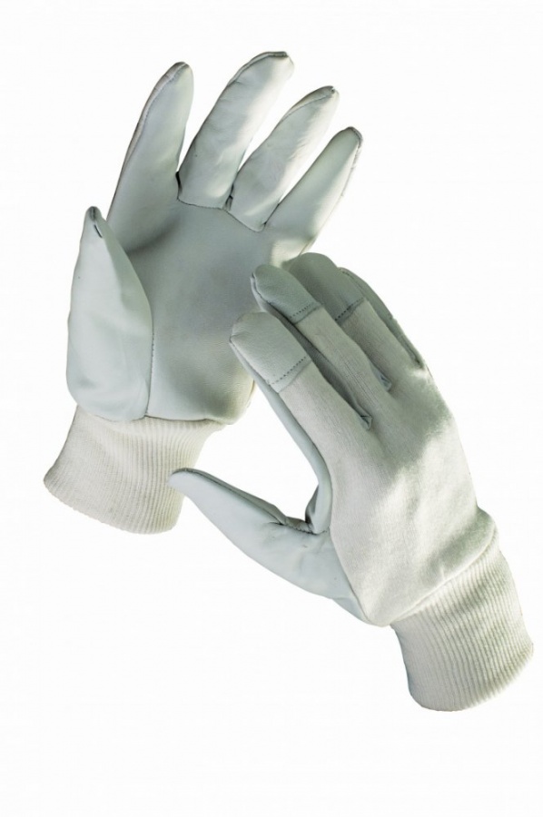 Rukavice z lícové ovčiny v dlani, bavlněné tkaniny na hřbetu, s překrytými špičkami prstů a nápletem na zápěstí.