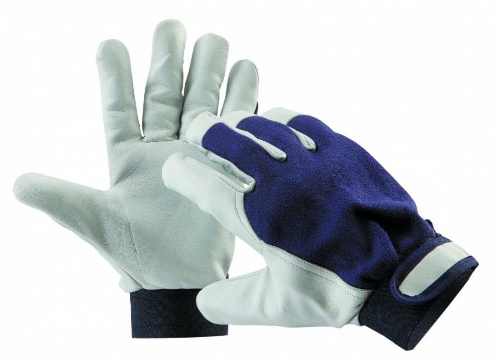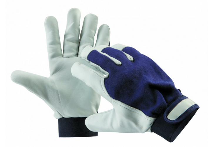 Rukavice šité z jemné lícové kozinky v dlani, modré bavlněné tkaniny na hřbetu a s manžetou na suchý zip.