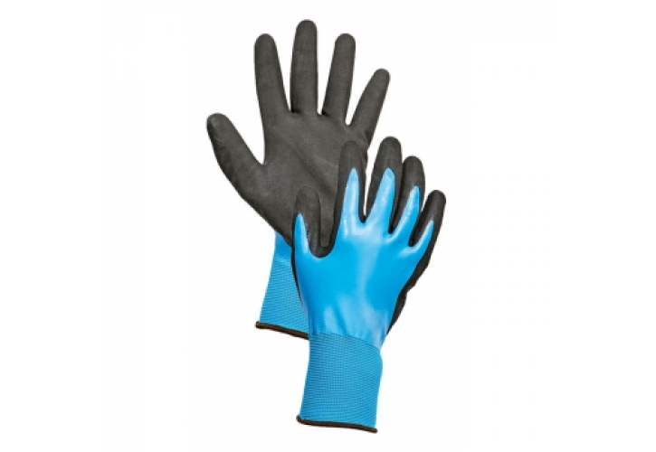 Pletené bezešvé nylonové rukavice, 2x máčené v latexu, protiskluzová úprava v dlani a na prstech, průžný náplet na zápěstí.