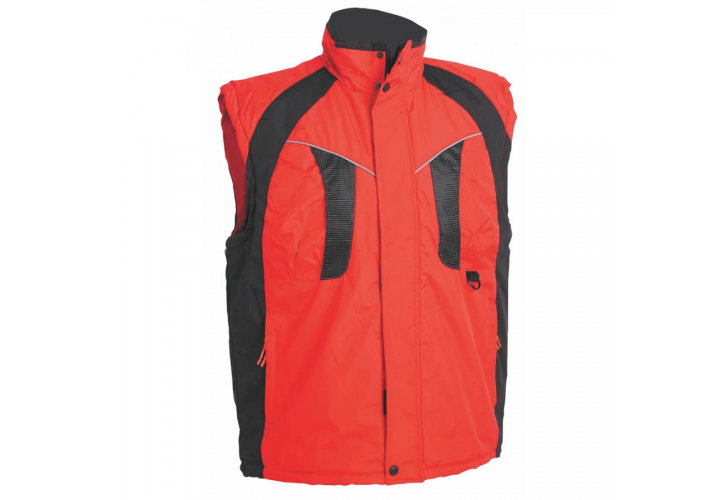 Zateplená nepromokavá vesta se stojáčkem, spodní lem ke stažení na šňůrku, reflexní doplňky, prodloužená táhla zipů pro snadnější manipulaci v rukavicích. Materiál: 100% polyester/PVC, 230 g/m2.