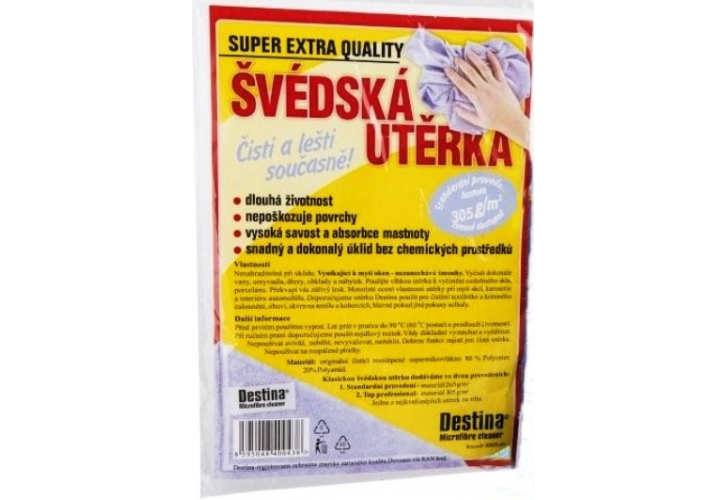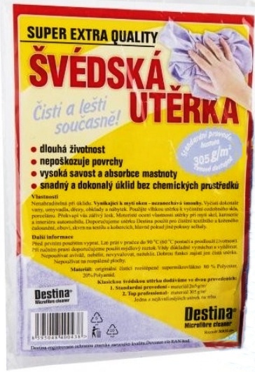 Švédská utěrka z mikrovlákna o rozměru 40x40 cm je ekologická utěrka na veškeré povrchy, která čistí a leští i bez použití chemických prostředků. Má dlouhou životnost. Nepoškozuje povrchy a nepouští vlákna. Utěrka nezanechává šmouhy a nečistoty. Disponuje vysokou savostí a absorbcí nečistot. Můžete prát do 60 °C bez aviváže. Použítí je možné suchou i namočenou utěrkou. Švédská utěrka je složena z 80% polyesteru a 20% polyamidu.