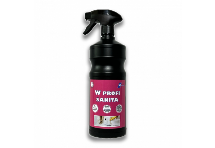 Profesionální čisticí W-Profi sanita je vysoce účinný prostředek s obsahem organických kyselin a intenzivní dlouhotrvající vůní. Na odstranění vodního kamene, zbytků mýdla, rzi, minerálních a močových usazenin, vápenných nánosů, případně cementových zbytků. Při pravidelném použití oživuje povrchy a zabraňuje jejich opětovnému znečištění. Hustá pěna spolehlivě ulpívá i na hůře dostupných místech a prodlužuje čas působení. Pro čistotu, lesk a ochranu povrchů nejen v koupelnách. Místa přicházející do přímého styku s potravinami je nutno důkladně opláchnout pitnou vodou. Vhodný i na postavební úklid.