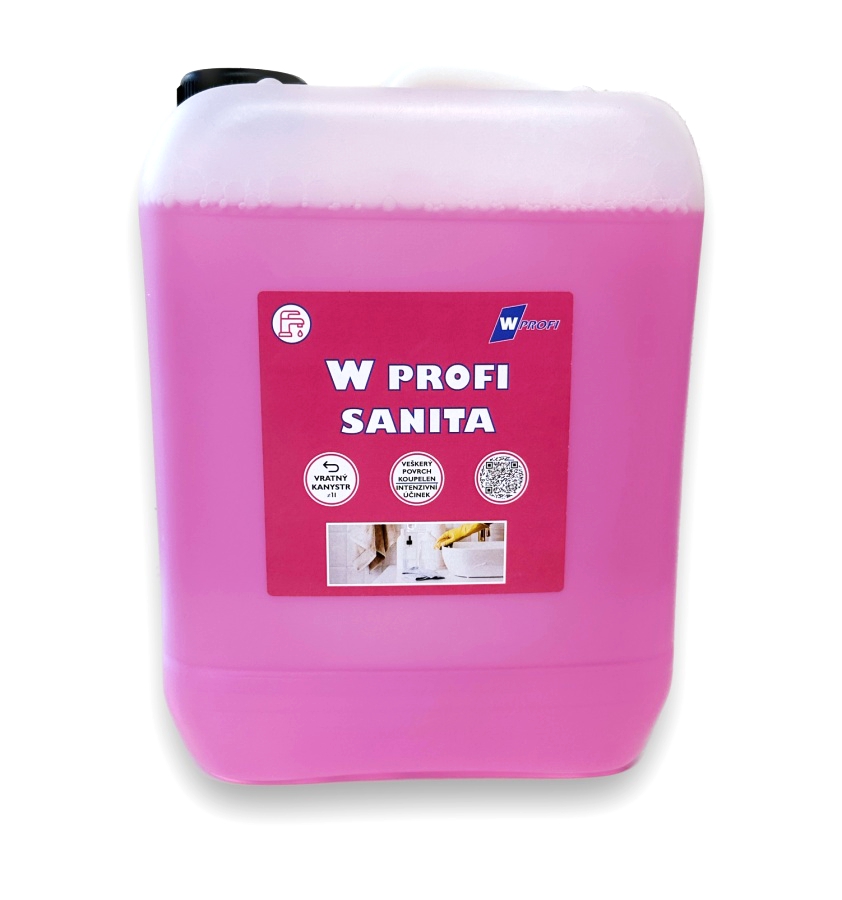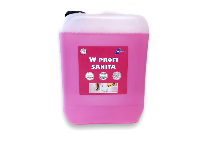 Profesionální čisticí W-Profi sanita je vysoce účinný prostředek s obsahem organických kyselin a intenzivní dlouhotrvající vůní. Na odstranění vodního kamene, zbytků mýdla, rzi, minerálních a močových usazenin, vápenných nánosů, případně cementových zbytků. Při pravidelném použití oživuje povrchy a zabraňuje jejich opětovnému znečištění. Hustá pěna spolehlivě ulpívá i na hůře dostupných místech a prodlužuje čas působení. Pro čistotu, lesk a ochranu povrchů nejen v koupelnách. Místa přicházející do přímého styku s potravinami je nutno důkladně opláchnout pitnou vodou. Vhodný i na postavební úklid.